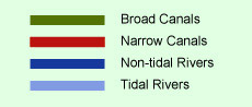 All navigable waterways in England, Scotland and Wales are displayed on this map. The colour and line type denotes the type of waterway and it's current status (see legend). Use the controls at the bottom of the window to zoom in and out and move around. The black box in the thumbnail image bottom left can also be dragged to re-position the map.
